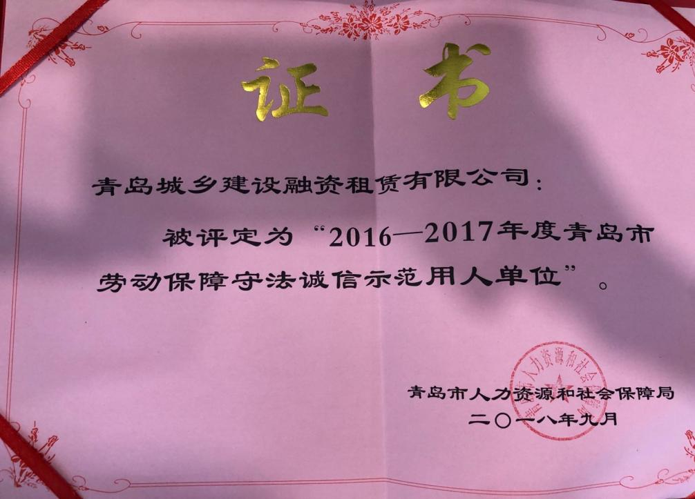 榮獲2016-2017年度“青島市勞動保障守法誠信示范用人單位”