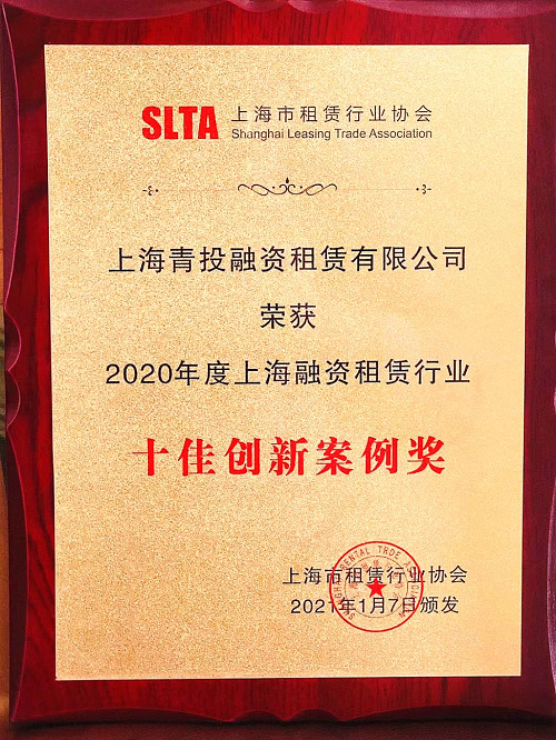 上海青投融資租賃有限公司榮獲“2020年度上海融資租賃行業(yè)十佳創(chuàng)新案例獎”