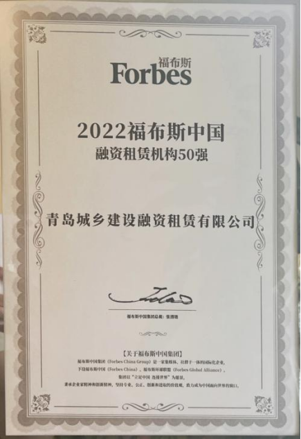 榮獲2022福布斯中國融資租賃創(chuàng)新潛力機構